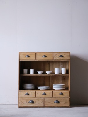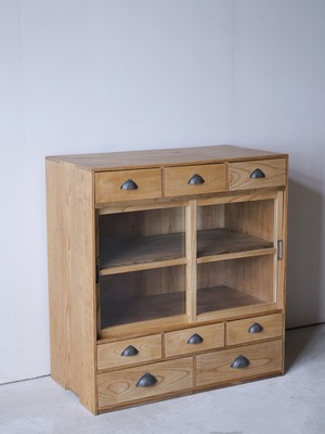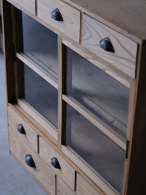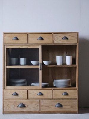 引出8杯付きのガラス戸棚。