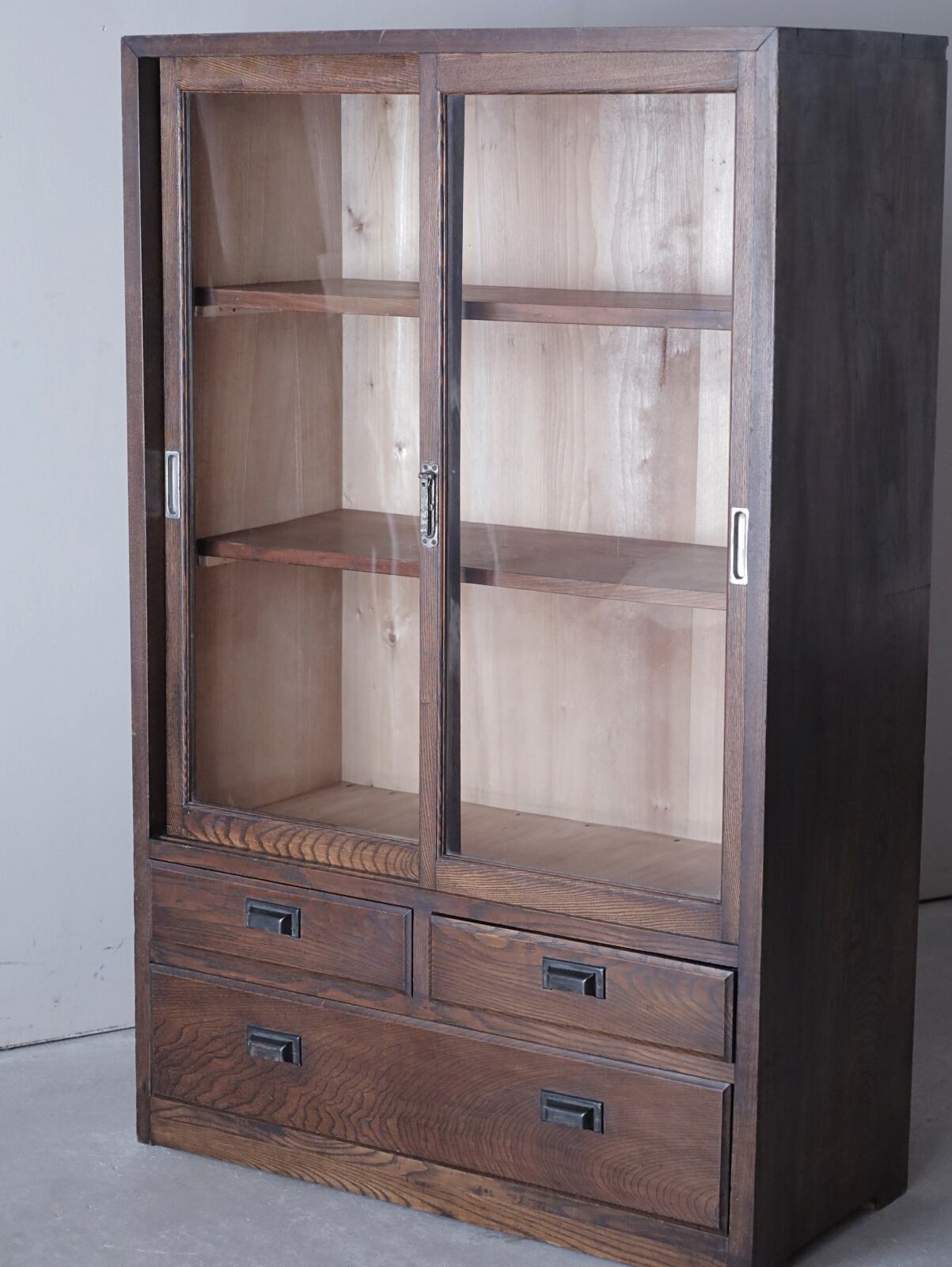 落ち着いた濃い色味のガラス戸棚。